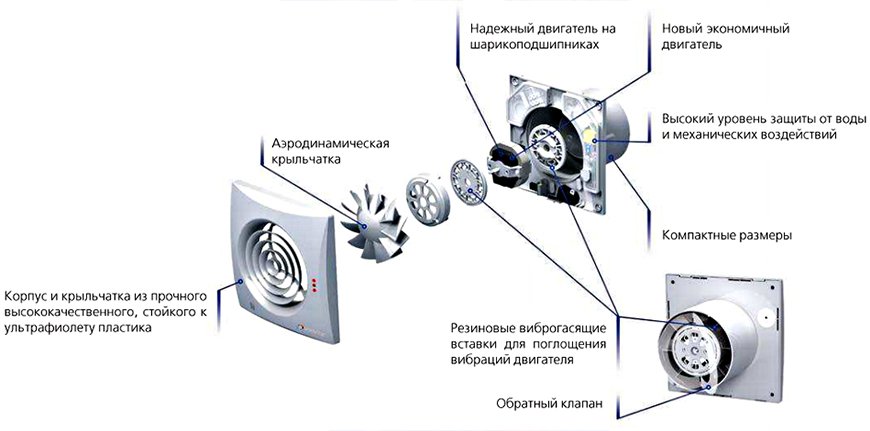 Impeller blades have a certain slope. It causes the passage of air through the fan system, partially prevents the reverse capture of the exhaust stream and contributes to the formation of pressure, which carries the air into the ventilation duct.
