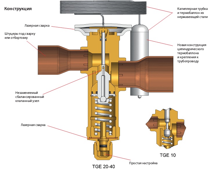 Unlike other components of the refrigeration circuit, the cross-section for the passage of freon in the thermal expansion valve is small. Its adjustment depends on the evaporation temperature of freon in the heat exchanger and the pressure value. Prior to expansion joints, the compressed gaseous freon in the condenser heat exchanger has excess pressure pumped by the compressor. After expansion valve expansion, the pressure in the evaporator heat exchanger decreases.