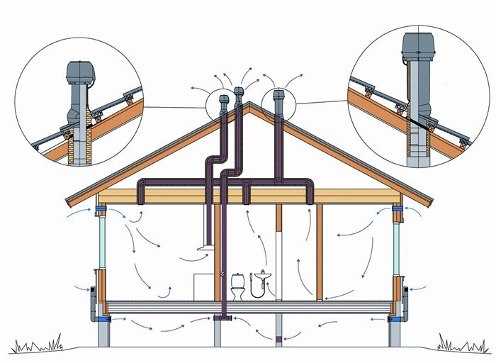 - Without fail, in any private residential building, the inflow and outflow of air masses must be ensured not only in the rooms where people live directly and spend most of the time (bedrooms, living rooms, kitchen), but also in utility rooms, such as a bathtub, toilet, laundry, etc.