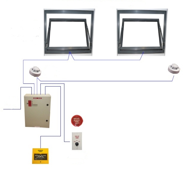 Another element of the system is automation, which opens windows and doors in case of fire. These elements are not included in the mandatory systems. They are used in places where there is a large area of glazing, and this makes it impossible to install smoke mines.