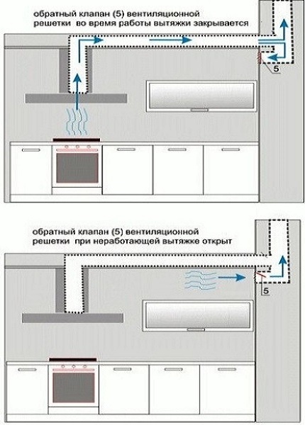When organizing air exchange in the kitchen It is important to ensure that new air comes exclusively from the street. This will prevent air masses from entering the kitchen room with excess odors and moisture, as well as low oxygen content. Only methane or propane-butane gas stoves are not enough to work.