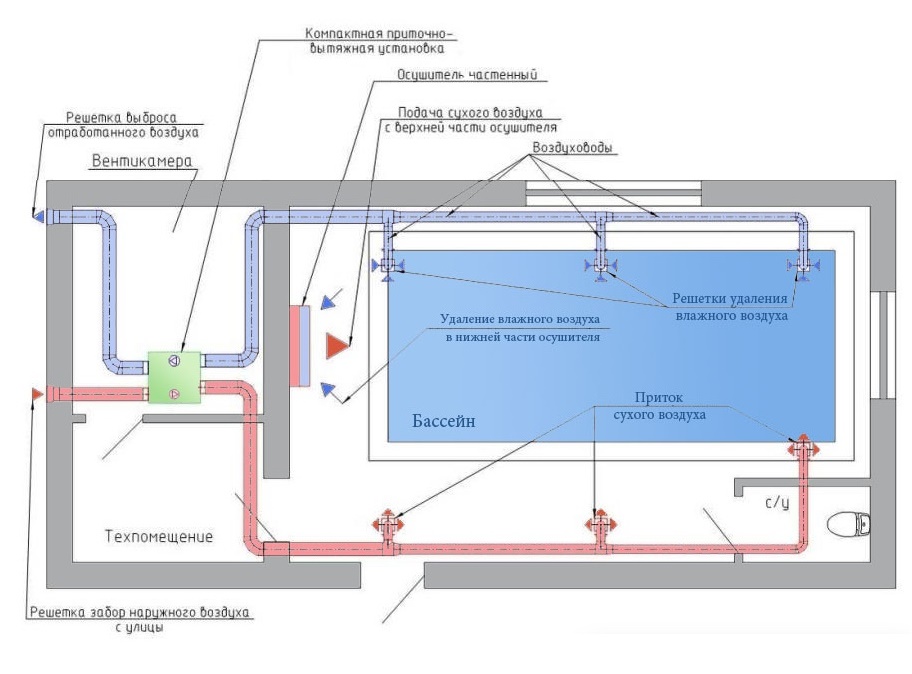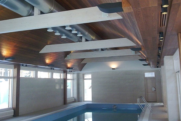 The forced ventilation system removes unpleasant odors that occur in the pool with high humidity. The installation of the supply and exhaust system is effective with a small pool area and not intensive use.
