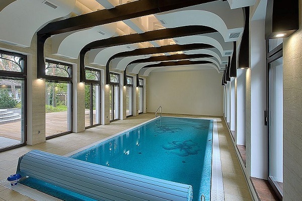 Most often, a room is given for him on the ground floor. Preference is given to options with a water surface area of 18-50 m2 and a depth of approximately 1.2 to 2.0 m. Along the perimeter of the tank, tracks and places for rest are arranged. The main requirement for private pool projects is the safety and comfort of people.