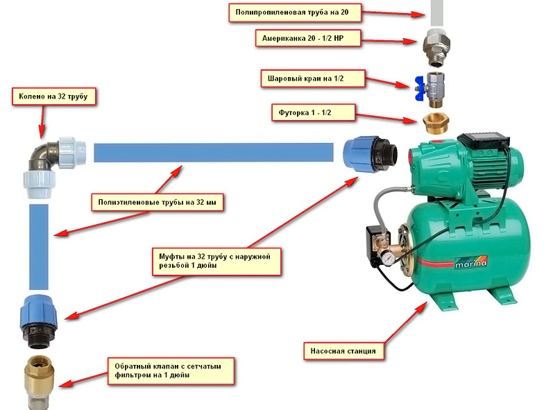 The outlet of the pumping station typically has a 1 inch thread. But this diameter is not so important when installing the system - it can be easily reduced to half an inch. The supply line is no longer operated by a pump, but by a hydraulic accumulator. Therefore, a possible increase in the load due to the smaller cross-section of the pipeline does not play a role.