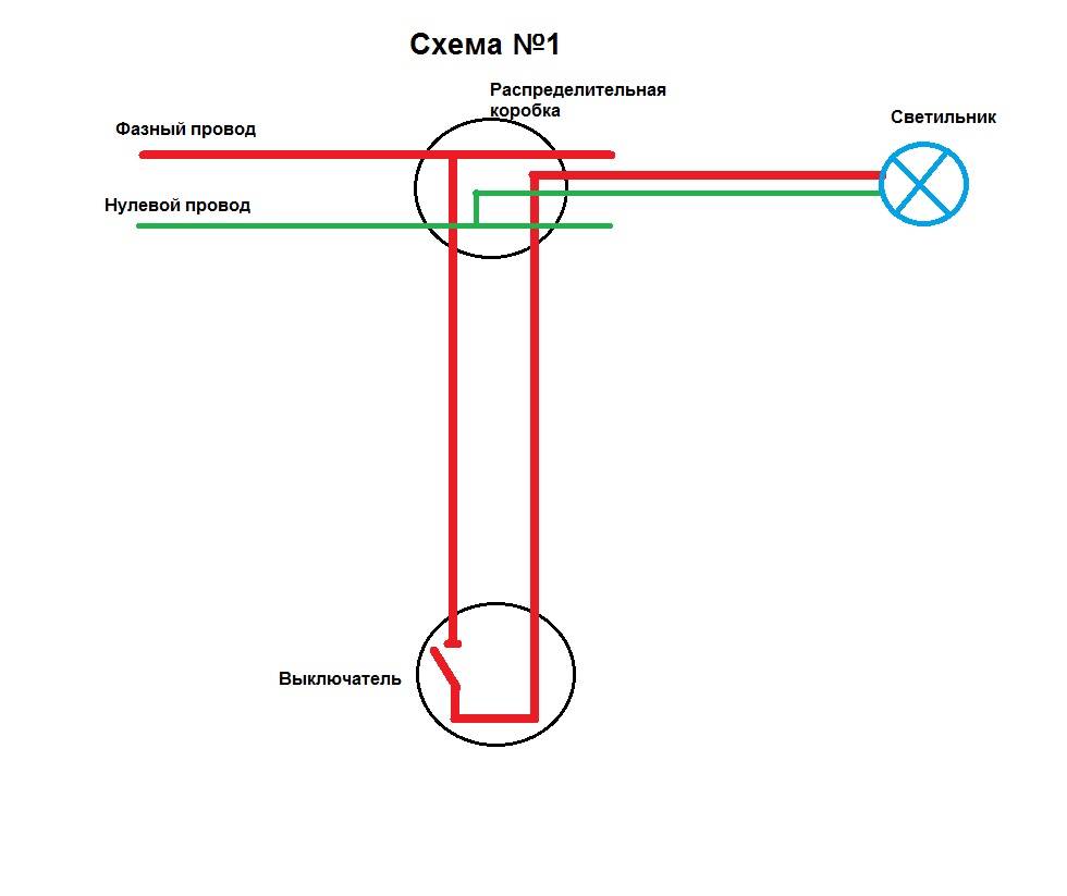 Pour que la logique de ma décision soit claire pour vous, je vais décrire le circuit d'alimentation de la lampe de cuisine. Je ne dessinerai pas un schéma de circuit, mais un schéma de câblage - je l'appellerai le schéma n ° 1 (indiqué ci-dessous le texte de la réponse).
