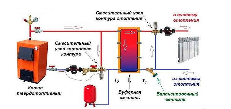 2. Les chaudières à combustible solide ont un système plus complexe que les chaudières à gaz. Il est plus facile d'organiser un chauffage efficace dans le bâtiment. Sur la figure 1, le diagramme le plus simple est illustré. Il est possible d'atteindre l'efficacité de chaudière promise selon le passeport, au moins en utilisant un ballon tampon. Un tel système permet d'économiser jusqu'à 20-30% de carburant. Un exemple est illustré à la figure 2.