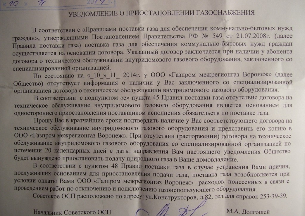 Assez 2 mois de retard pour rester sans gaz. Les propriétaires de maisons privées devraient lire les lois plus en détail, ils seront en premier lieu coupés des communications. En été, les arrêts sont dus à des dettes, à l'état des équipements, à des actions non autorisées.