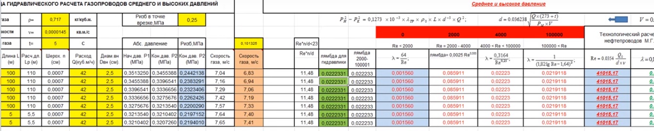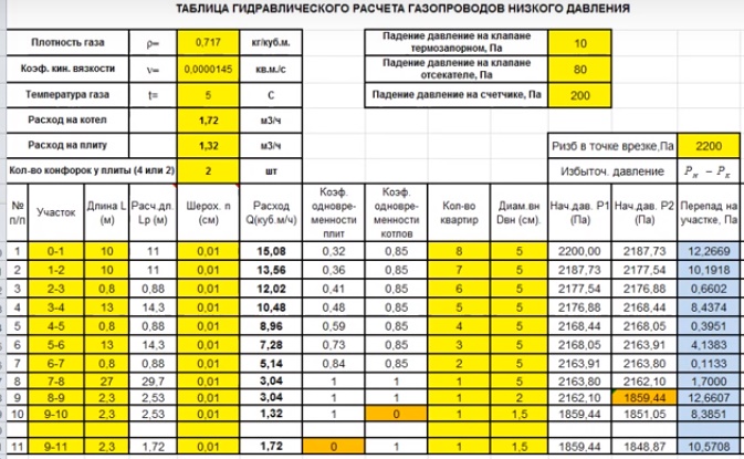 Un exemple de calcul hydraulique à l'aide du programme pour les gazoducs à basse pression est donné. Dans le tableau proposé, toutes les données que le concepteur doit saisir indépendamment sont surlignées en jaune.
