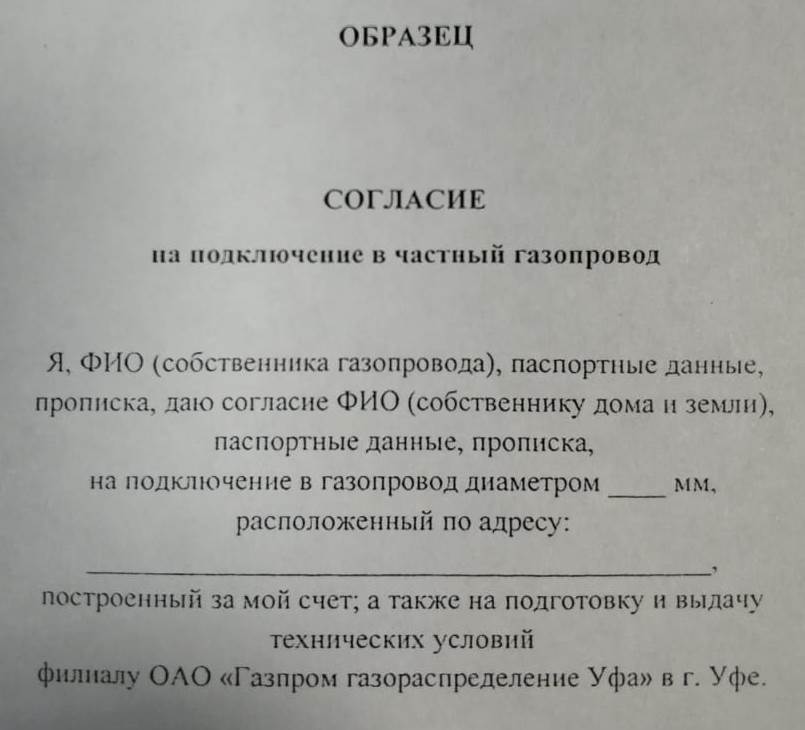 Vous ne pouvez pas rechercher comment un tel document est rempli, le consentement de l'abonné principal à la connexion de gaz n'est pas écrit selon le modèle établi, bien que le contenu soit à peu près le même.