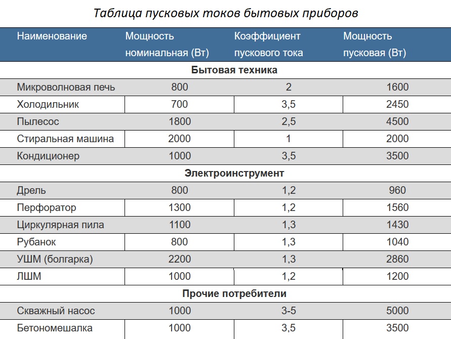 Le paramètre de puissance d'un appareil particulier pour les calculs doit être extrait de son passeport. Et n'oubliez pas le courant de démarrage - certains équipements nécessitent plusieurs fois plus d'électricité pour démarrer que pour fonctionner.