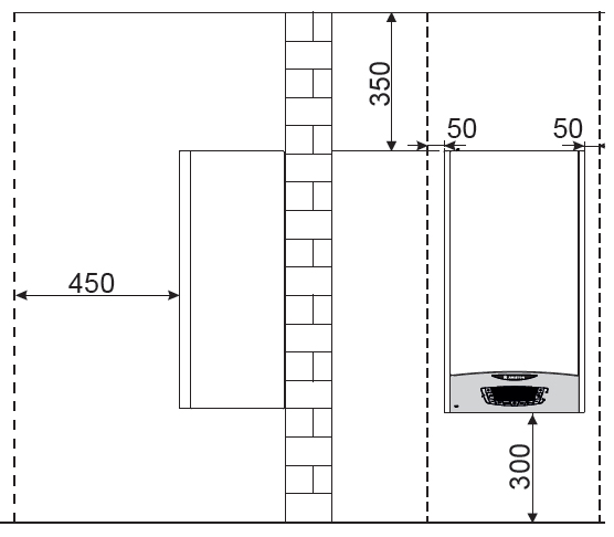 La chaudière domestique à gaz Ariston est montée sur un mur solide, construit sur la base d'un matériau incombustible, qui peut supporter le poids total de l'équipement.L'emplacement de la chaudière à gaz doit être sélectionné en tenant compte de l'exposition aux distances minimales autorisées (schéma ci-dessus) aux objets à proximité. Ces exigences sont conçues pour fournir un accès pour une maintenance pratique.
