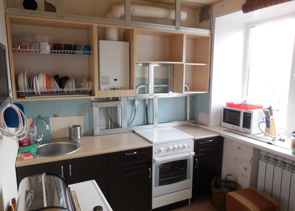 Même avec un agencement compliqué des communications dans la cuisine, les tuyaux de gaz peuvent être cachés derrière un faux mur: