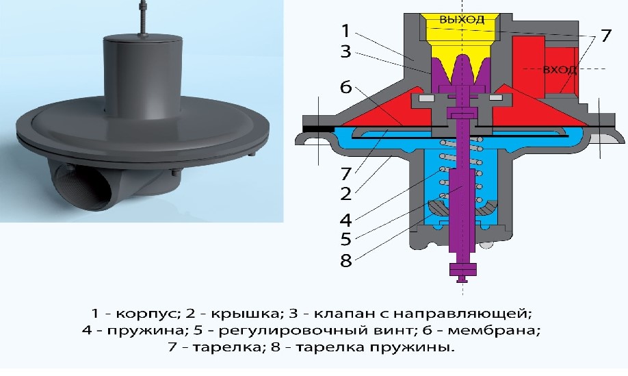Le principe de fonctionnement de la soupape de protection est simple: dès qu'un excès de gaz pénètre dans l'appareil et commence à exercer une pression sur la membrane, il agit sur le ressort, ce qui ouvre la sortie. Dès que la pression revient aux paramètres de fonctionnement, le ressort ferme le trou.