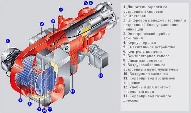 Les principaux éléments structurels du brûleur à gaz sont considérés dans le schéma ci-dessous.