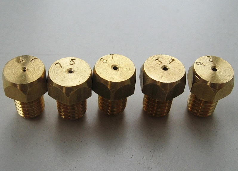 Les diamètres des trous, le pas de filetage et la longueur de la pièce sont différents dans les buses (pour les combustibles naturels - la longueur est plus courte, pour les liquéfiés - plus longs). Les dimensions du diamètre du canal sont repoussées sur la tête de la pièce (en centièmes de millimètre, le marquage est beaucoup moins courant en mm).