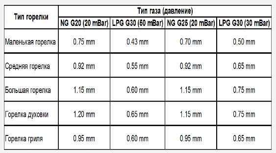 Pour le gaz de ballon, le diamètre de la buse (avec la même conception et la même puissance du brûleur) a besoin d'un peu moins, pour le gaz naturel - un peu plus.
