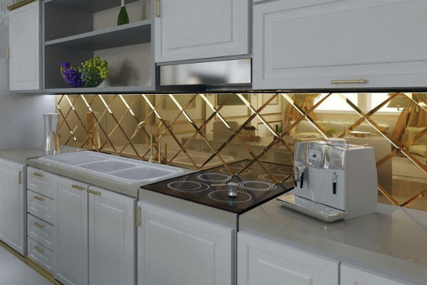 Le revêtement miroir présente également des inconvénients. Le principal est la complexité de l'installation. De plus, pour que le revêtement miroir soit élégant et agréable sur le plan esthétique, son aspect doit être constamment maintenu propre. Par conséquent, préparez-vous au fait qu'après chaque cuisson, un tablier de miroir devra être nettoyé de la saleté.