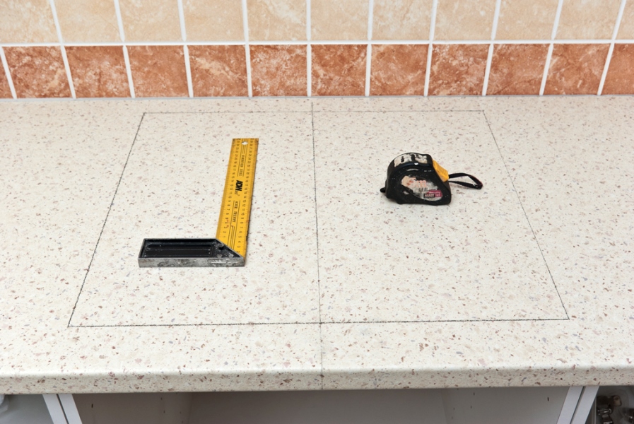 Connaissant les dimensions exactes de la table de cuisson, vous pouvez faire un trou dans le comptoir à l'avance. Bien sûr, l'usine le gérerait plus professionnellement, car il est très important de couper un rectangle soigné avec des angles droits et même des côtés.