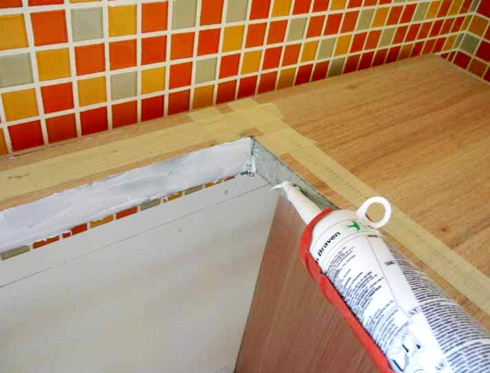 Si le matériau du comptoir s'effrite aux endroits de la coupe, vous pouvez traiter les bords avec n'importe quelle composition de colle, mais vous devez d'abord poncer et passer l'aspirateur. Le silicone sanitaire est utilisé pour les panneaux de particules - il protège en outre les bords de l'humidité.
