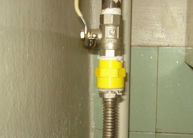 - Nous connectons le tuyau de gaz au diélectrique. Sinon, puis au tuyau métallique immédiatement après le robinet. Pour la densité adjacente, nous utilisons du lin ou du ruban adhésif.