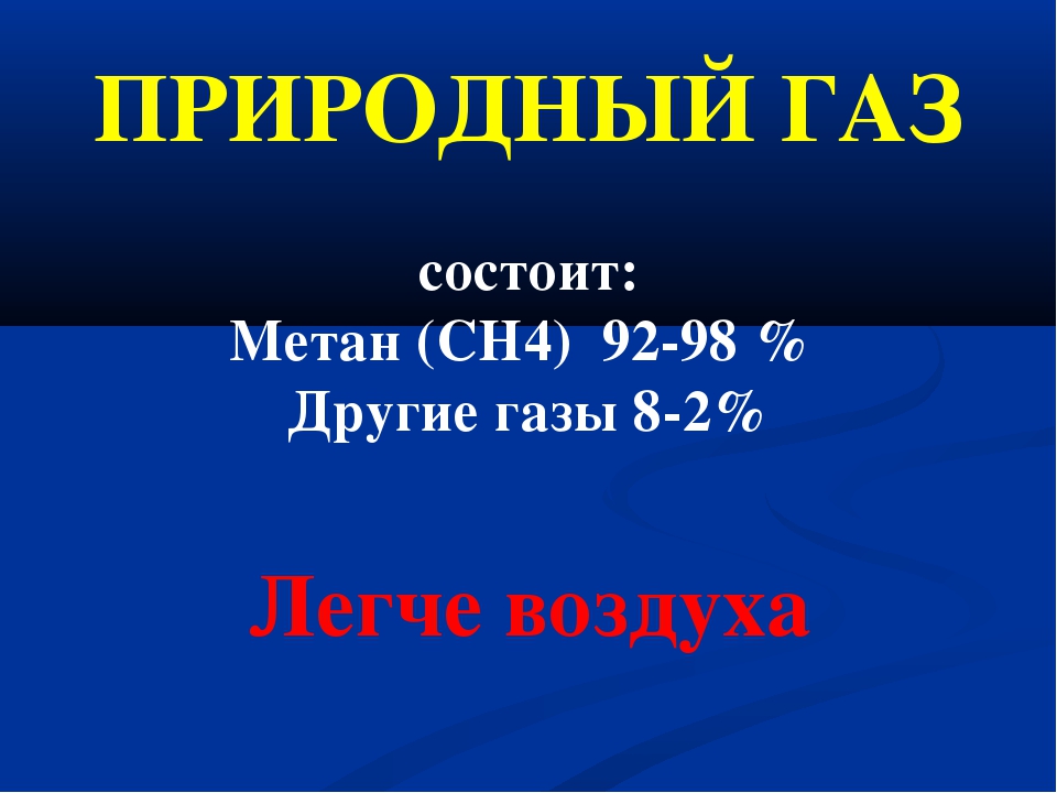 La valeur inférieure de la concentration explosive de gaz naturel est de 4,4% de la masse d'air totale. Le pic explosif est atteint à une concentration de 9,5%. Lorsque l'air est rempli à plus de 17%, le méthane brûle simplement, ne menace pas une explosion, mais peut avoir un effet toxique sur l'homme.