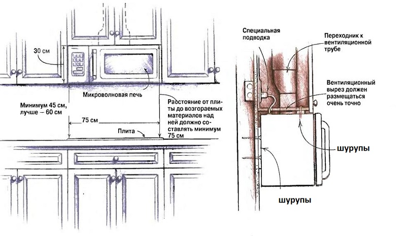 Selon les règles de sécurité, les fours à micro-ondes eux-mêmes n'ont pas besoin d'une ventilation améliorée, mais une telle conception devrait l'être, si l'appareil est censé être installé au-dessus du poêle.