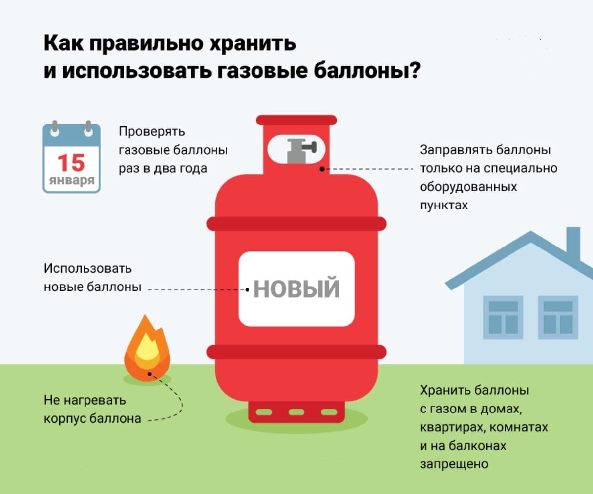 Les magasins d'articles ménagers ont des joints pour des bouteilles de gaz de 12, 27, 50 litres et des conteneurs de tailles moins courantes. Les bouteilles elles-mêmes doivent être stockées à l'extérieur des bâtiments résidentiels, des appartements et des étages techniques, loin des voies d'évacuation.