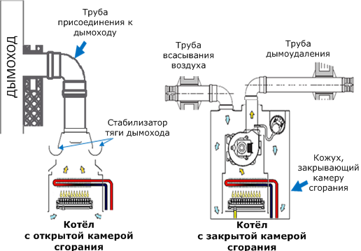 Vous devez également comprendre qu'en fonction de la chambre de combustion (ouverte ou fermée), le design de la cheminée sera sélectionné (photo jointe).