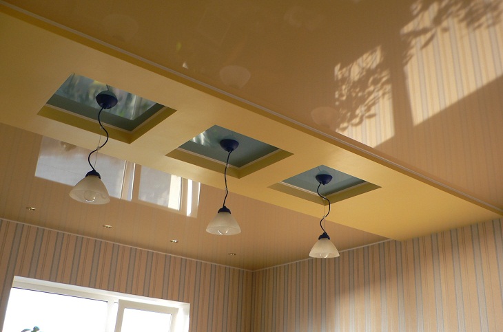 Egy ilyen pite után biztonságosan rögzítheti a PVC-ből, szövetből vagy akusztikus vászonból készült nyújtható mennyezetet és csatlakoztassa az izzókattelepítési helyek, amelyeket szintén előre terveztek és készítettek elő. A vászon felszerelésekor fontos, hogy 2 cm-re visszahúzódjon, és ne tovább, hogy ne provokálja a „dobhatást” a túl nagy rés.