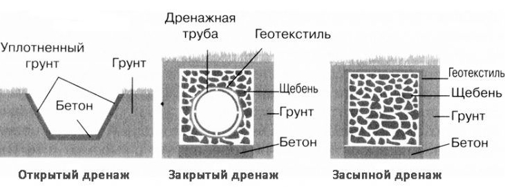 Il existe plusieurs variétés de drainage qui peuvent être effectuées sur le site.Selon la profondeur de la nappe phréatique souterraine, le drainage est divisé en surface et en profondeur.