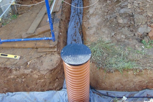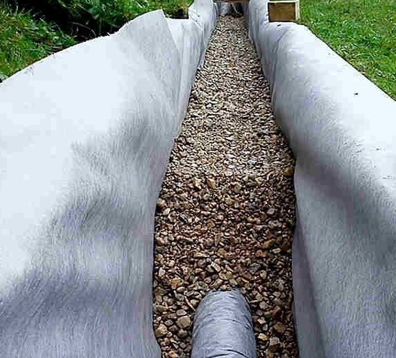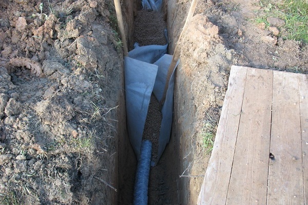 La structure résultante est recouverte des deux bords du chevauchement géotextile de sorte que le tuyau est complètement enveloppé dans du tissu. Aux endroits où le pipeline tourne, des puits d'inspection sont installés.