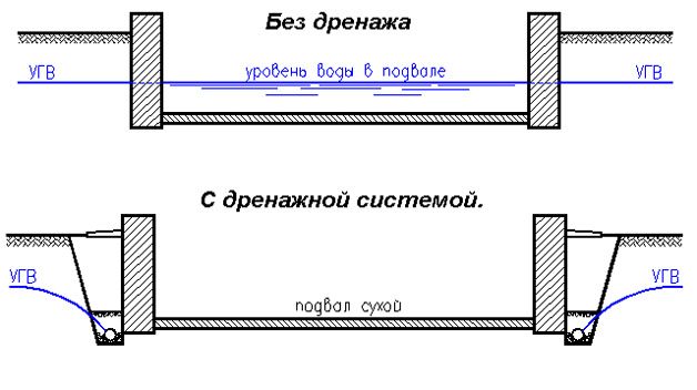 La situation est similaire dans les zones avec des miroirs d'eau souterraine surélevés. Là, c'est elle qui empêche les inondations et les précipitations atmosphériques de pénétrer dans les couches sous-jacentes. Dans les zones à haut niveau d'eau souterraine, généralement situées dans les basses terres, même une fondation enfouie dans un sol sablonneux a besoin d'un système de drainage protecteur.