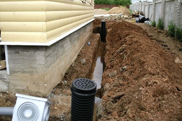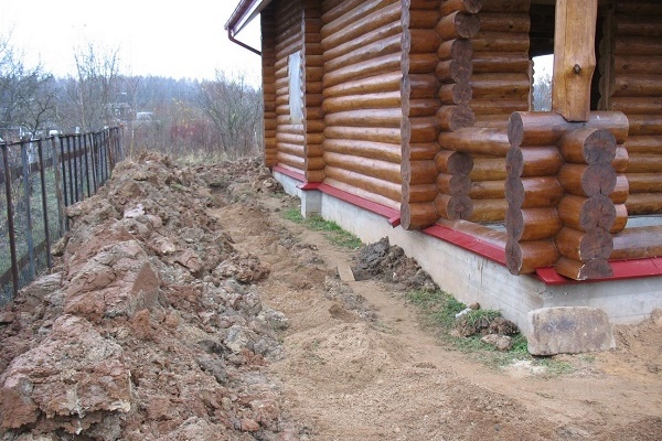 Une tranchée est creusée autour du périmètre de la maison entière d'un demi-mètre plus profondément que la fondation de fondation. Sur les zones de retournement, il est nécessaire de prévoir des emplacements pour l'installation de puits de drainage. Lors de l'installation d'un système de mur, la tranchée creuse soit près de la maison elle-même, soit à une distance ne dépassant pas un demi-mètre de la maison.