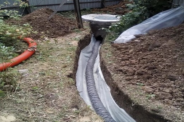 Afin de se débarrasser des eaux souterraines, il a été décidé de construire un système de drainage avec sa sortie dans le puits collecteur avec un fond absorbant.