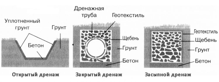 - profond (fermé) - le drainage de l'eau est effectué à l'aide d'un système de tuyaux, de puits; le système est utilisé en cas de risque d'inondation du jardin avec des précipitations et / ou des eaux souterraines;