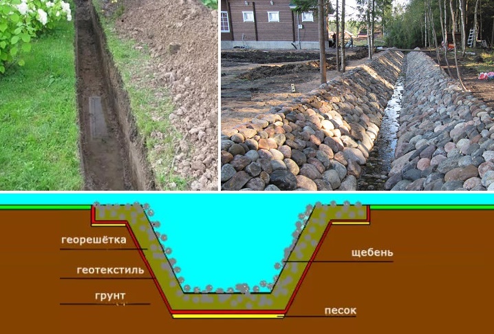 Pour un système ouvert, il suffit de construire des fossés d'une profondeur de 0,7 m et d'une épaisseur de 0,5 m.Les murs sont réalisés avec une pente, l'angle de biseau est de 30 degrés. Le fossé est conduit dans un puits d'égout, qui est commun aux sites ou à toute autre prise d'eau.