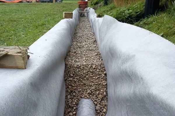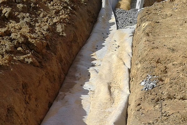 - Ils remplissent la tranchée de sable à 10 cm, après quoi ils ajustent la couche de géotextile de sorte que les bords de la toile soient plus hauts que le renfoncement.