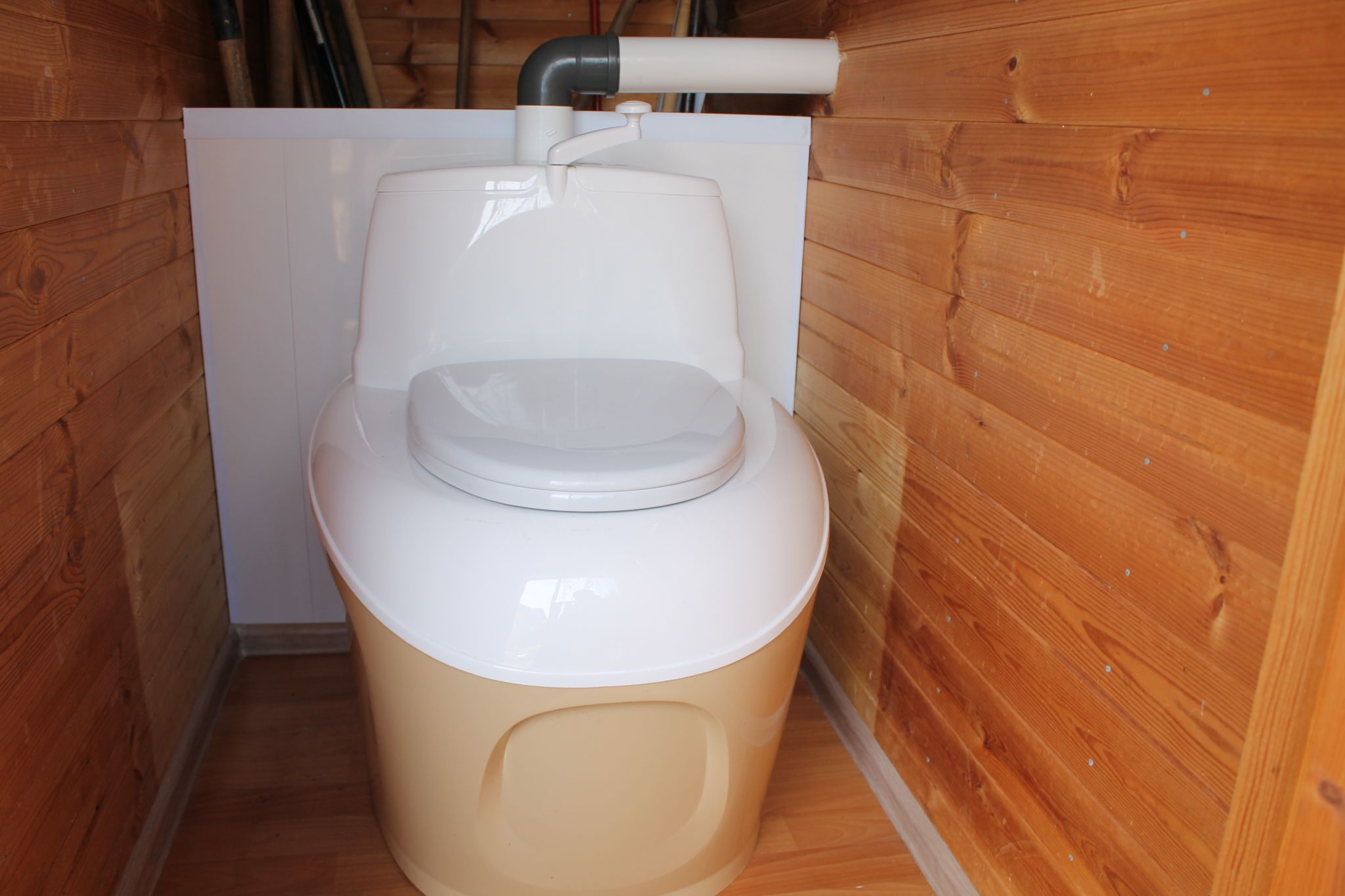 Dans certains cas, le placard sec finlandais est complété par un tuyau d'échappement, il est conduit dans un trou spécial ou dans la fenêtre. Il doit occuper une position verticale, hauteur - au moins 2 m. S'il y a un puisard ou une fosse à compost à proximité, un tuyau pour évacuer les déchets liquides peut être intégré dans la partie inférieure.