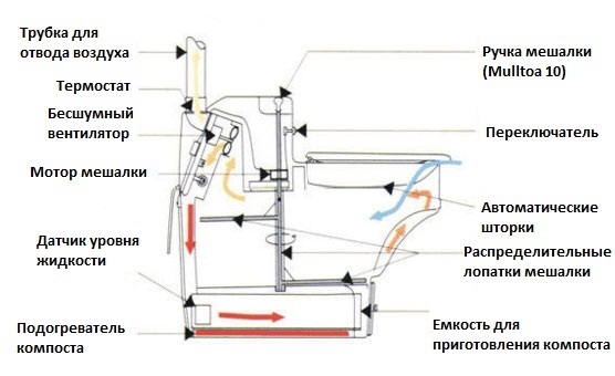 - Compostage. Il s'agit notamment des modèles sans tourbe et sans liquide. Dans le premier cas, le liquide n'est pas détourné, mais participe au processus de traitement. Le deuxième type comprend toutes les toilettes autonomes électriques dans lesquelles les déchets sont transformés en compost à la suite de l'élimination du liquide de la masse, du séchage et du pressage.