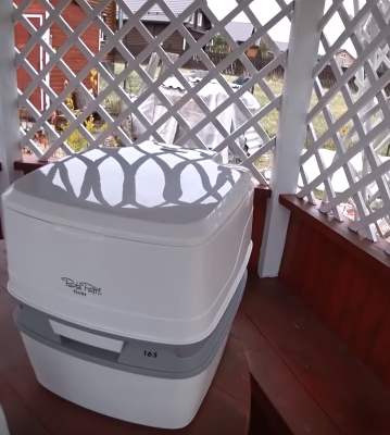 Si vous n'êtes pas satisfait des odeurs des toilettes à tourbe, je peux recommander une solution alternative peu coûteuse. Ceci est Thetford Porta Potti 165, coûte environ 80 dollars. Le placard sec se compose de deux parties, supérieure et inférieure.