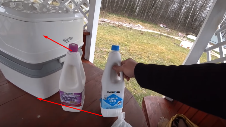 Pour chaque partie, un liquide séparé est nécessaire: dans le bleu inférieur, dans le rose supérieur. Pour 100 ml de chimie, vous avez besoin de 3 litres d'eau, remplissez un trou technique spécial. Une telle toilette peut être utilisée même dans la maison, il n'y a pas d'odeur.