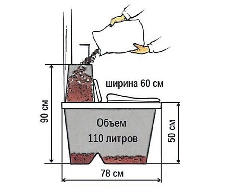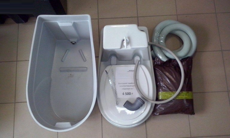 L'appareil hygiénique a un compartiment inférieur spacieux, dans lequel un bol durable est installé. Une couche de tourbe est versée au fond du réservoir. Par le haut, le compartiment est fermé par un couvercle dans lequel sont percés un trou et un siège. Au-dessus des modèles de tourbe se trouve un petit réservoir ressemblant à un réservoir ordinaire. Il est également rempli de tourbe sèche.