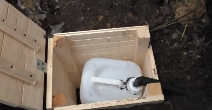 L'eau est versée dans le réservoir par le trou prévu à cet effet. Bien sûr, les toilettes sont couvertes. Après avoir utilisé le placard sec à sa destination, il vous suffit d'appuyer sur le levier de la pompe pour rincer.