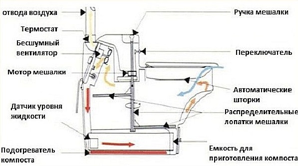 Le dispositif et la technologie de traitement des déchets dans une armoire électrique sèche sont un peu plus compliqués. Il prévoit la séparation des déchets en fractions liquides et solides. Les premiers - sont évacués dans un réservoir séparé ou un trou de vidange par un tuyau de drainage, les seconds - pénètrent dans le réservoir inférieur.