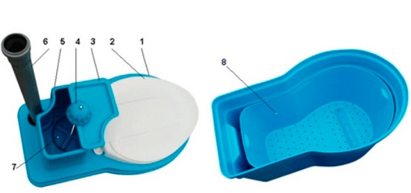 - Noeud supérieur. Conçu comme une toilette avec un siège, un couvercle et un réservoir pour la composition chimique ou liquide avec des composants naturels actifs. Une pompe de rinçage se trouve ici.