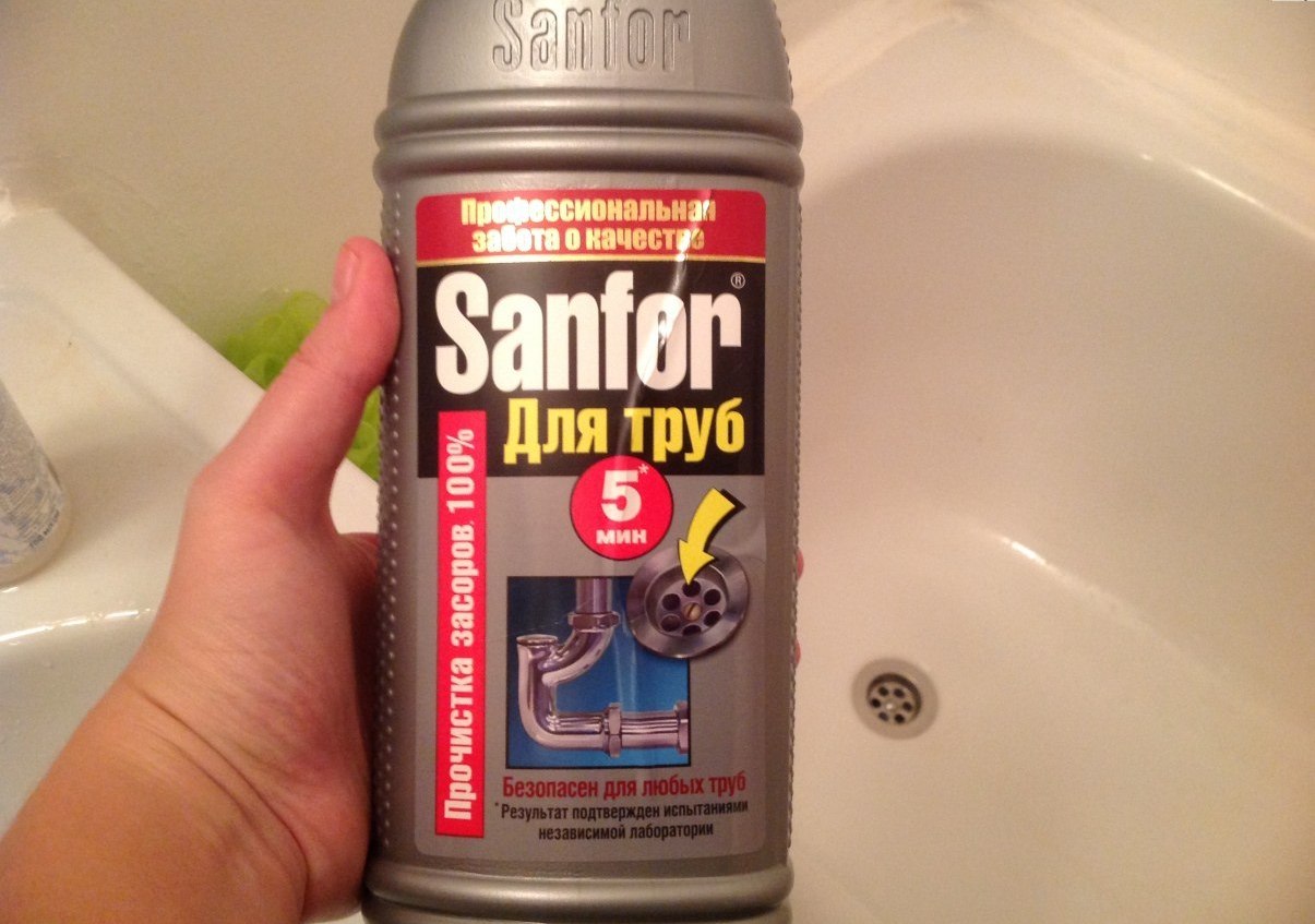 Sanfor - gel épais. 250 ml du produit sont versés dans l'orifice de vidange. Avec de petits blocages, il suffit de résister de 5 à 15 minutes, avec des forts - un peu plus, et ensuite, rincez le système pendant une minute sous une forte pression d'eau.