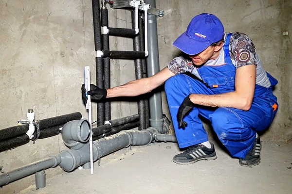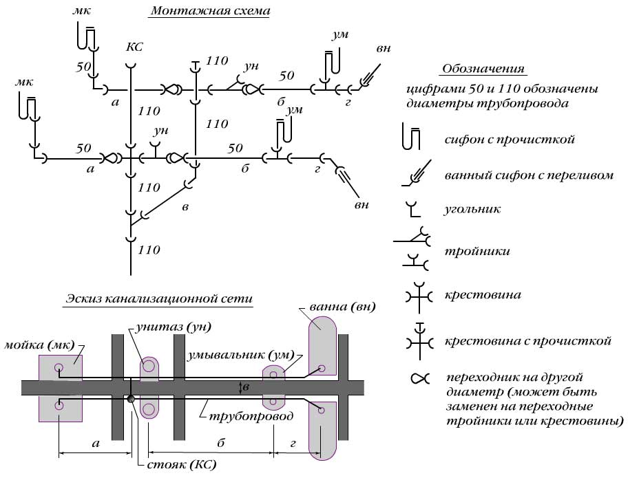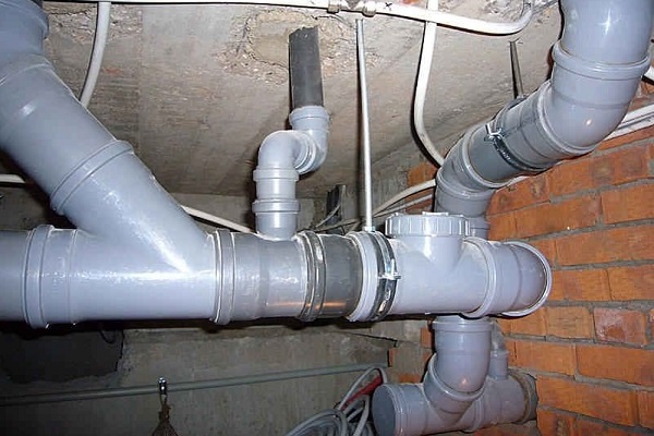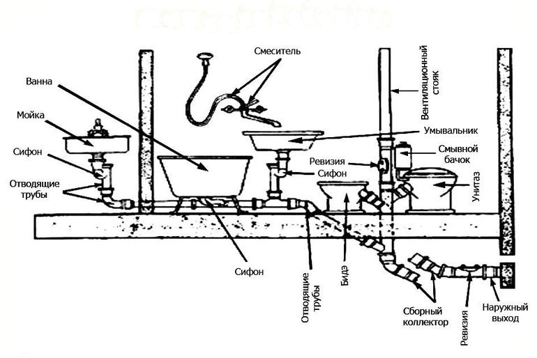 - Acheminement des tuyaux - les virages menant aux équipements de plomberie. Le diamètre du tuyau menant des toilettes est le plus grand - 100-110 mm, le reste est de 50 mm chacun.