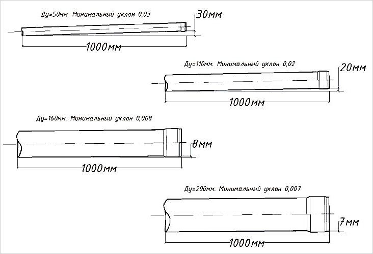 L'inclinaison est une condition préalable à un système de gravité. L'angle d'inclinaison dépend du diamètre du tuyau. Il y a des paramètres dont il n'est pas recommandé de s'écarter: pour les tuyaux de 50 à 80 mm - 25 à 35 mm / mètre de la ligne.