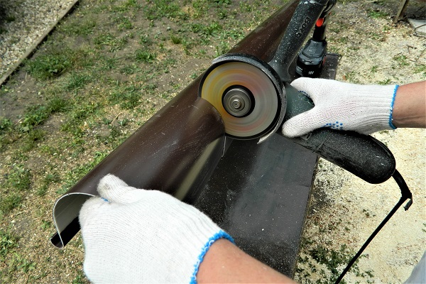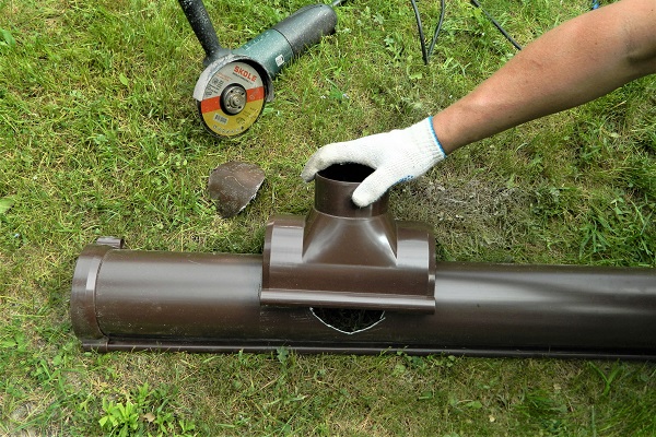Pour ce faire, placez-le au bon endroit sur la gouttière, dessinez un contour, puis retirez et percez un trou avec une perceuse avec une couronne appropriée. Nous nettoyons les bords et connectons l'entonnoir au trou.