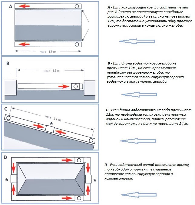 - Nombre de contremarches. Traditionnellement, les tuyaux de drainage sont positionnés aux coins de la tâche - il peut y en avoir 2,3 ou 4. Mais si la longueur de la gouttière est supérieure à 12 m, un entonnoir de compensation supplémentaire avec un tuyau est installé au centre.